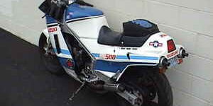Cycle Worlds readers collection. Fox shock, Olins stering damper, fork brace, wolf pipes, GSXR wheels, JMC swing arm, Skidmark twin head lights. Many polished parts. Parked for ten years, never broken just tired.