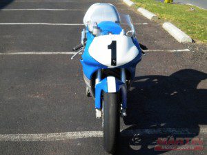 This particular bike is a performer, having won multiple ARMHA championships. Like most well-used race bikes, this vehicle has likely seen a little road rash during its lifetime. Fortunately, it is now sporting pretty new livery (so new that no padding has been added to the seat area); the blue/silver/white pattern is certainly striking on this bike.