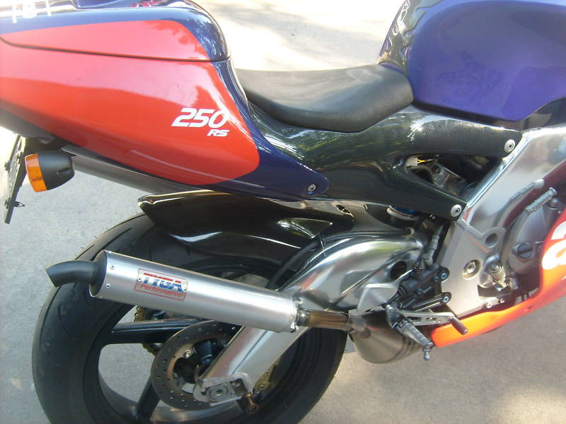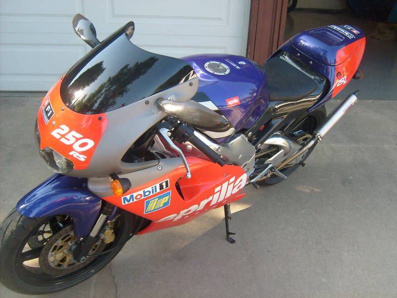 im thinning out the herd and this one is the nicest. its a 1994 aprilia rs250 the bike has 3900 km and is in near perfect condition. the aftermarket parts are tyga side by side pipes and silencers, mild steel headers. new tires with 40 miles on them, and new chain, are replaced only due to age not wear. the bike had some minor but annoying scratches on the tail section and the the left and right lower fairings so as anal as i am i had them repainted with the reproduction decals. i could not get the tail section decals that said rs250 so i had a sign shop make some up. the bike looks new and runs awesome.