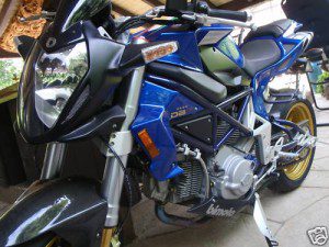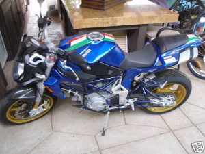 I must admit I’m usually not a huge fan of Bimota design, but I really like this one. Bimota paired a Ducati 992 V Twin with their stellar design and this DB6 LE is the result. New, used or slighty used with 219 miles Bimota’s are usually priced well out of my price range and this one is no exception. Retailing for around $30,000.00 this Delirio Azzurro isn’t for the faint of heart or the guy who has a skinny wallet. But, don’t run away just yet because you can buy this LE for a mere $25,000.00 and save thousands 🙂 . Bimota only produced 23 of these and did so in honor of the Italian soccer team for winning the World Cup. That’s a pretty good honor eh?
