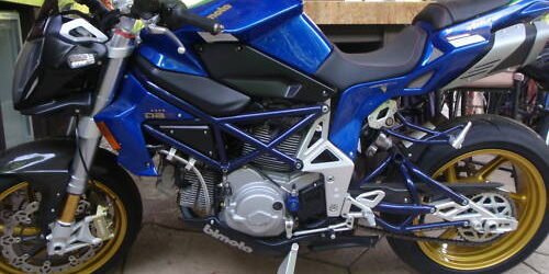 The Delirio, Bimota’s “naked” bike, the DB6 has been stripped of anything unnecessary and features highly technical chassis innovations. The front wheel features a 12.5 inch wavy disc, a Marzocchi Corsa fork and 4-pot radial Brembo callipers. The trellis frame and swing arm are linked by aluminum plates. Quick steering, instant punch from the 992 cc air-cooled V-twin Ducati 1000DS engine make the front wheel lift instantly. But the 375 lb beast has no problem stopping with such powerful brakes. The Delirio delivers outstanding performance, engine and framework, complimented by an agressive but comfortable riding position