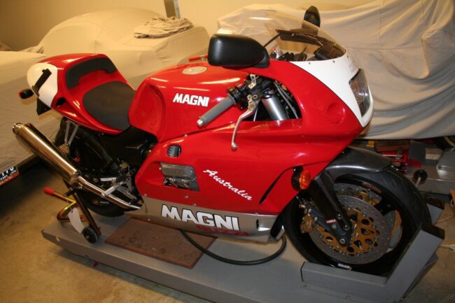Named in honor of their importer-turned-racer down under, the Australia was Magni’s signature homologation special. Using Moto Guzzi’s quattrovalvole 992cc twin, the Australia is off the sporty and rarity charts. This example is just out of a long restoration and looks like a new machine. 1998 Magni Australia for sale on eBay In road trim…