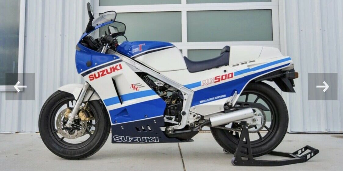 A near perfect fully tuned Suzuki RG500 Gamma 1986 model. Only 800 original miles and still on the original tires. Sold new in California this Canadian Spec bike spent its entire life with one owner until his passing. In a twist of fate the original importer who sold it got a phone call and bought it back. He had it fully serviced and then help it 5 years. The bike has a California title on non-op registration. Sold with a bill or sale and the pink if you so desire to register it. It came with the manuals tool kit and a full assortment or spares like a head gasket set and the stock Canadian turn signals and the rear seat. The bike currently has the euro turn signals on it. One small stain on the lower right corner of fuel tank from something leaning on it looks to be a rust stain. It’s reported the owner road the bike one summer then put it into his collection and never road it again. Great article about this motorcycle in pictures. Or Google Carrillo Suzuki RG500 Gamma.