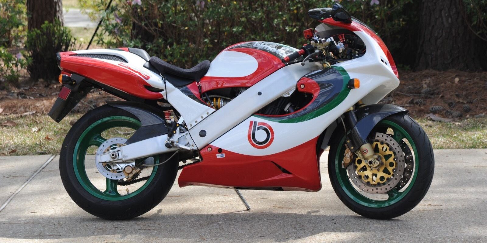 There are some very minor blemishes on this example, just some small chips around fairing fasteners. But aside from that awful touring seat pad that’d be in the garbage before I even got the bike home, the bike is pretty much immaculate and looks great in the very Italian tri-colore paintwork on the swoopy body panels. I personally prefer the look of the later SB6R, but there’s no doubt this is a very striking motorcycle.