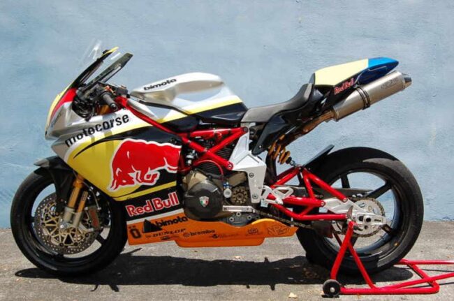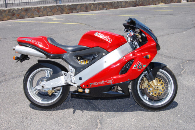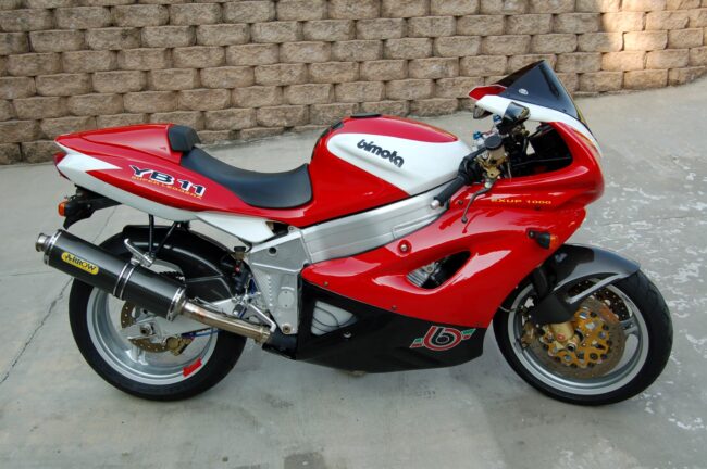 This Bimota ticks all the right boxes for me: It’s light, it looks fantastic, and it utilizes an old school approach to power and performance. In fact they not only revert from the then current 900 Supersport’s fuel injection to carbs, the race kit utilizes chokeless Keihin FCR carbs and a 2 into 1 titanium…