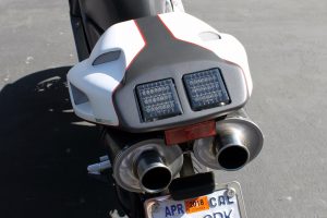 The fairings are all intact, no cracks, with brand new Ducati DZUS fasteners. Motodynamic LED integrated tail light with sequential blinker (really cool 😉