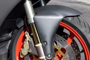 The bike has lot of carbon parts. The front fender and the tank protector are made of matte carbon to match the matte color of the bike.