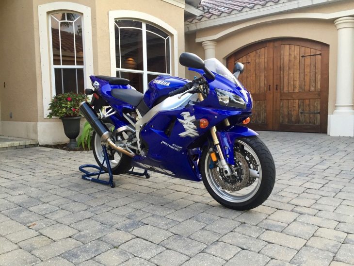 This particular R1 is in the first year blue/silver color scheme which seems to have been more popular than the white/red style. Condition looks to be absolutely pristine and the seller does a very good job with the photos showing the bikes condition. While service history/details aren’t much that is to be expected given the very low mileage.