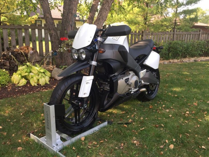 The black forks are at least a cosmetic improvement, and the owner shows a more road-oriented white front fender on the spares page, which would be going on first thing if it were mine. While the overall design might be an acquired taste, the STT reviewed as a great fun bike, no more or less practical than any other hyper, but the big torque makes it a leave-it-in-drive kind of ride. Fully sorted might be a good way to describe the XB2, a mature though innovative frame design and bombproof Evo motor, along with Buell’s funky solutions to some age-old motorcycle design issues…