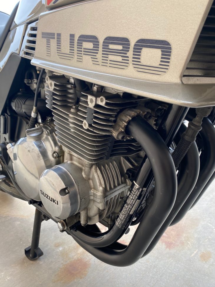 Suzuki’s XN85 Turbo was built for 1983 only, and combined moderate boost with mid-size 673cc displacement, stuck with air-oil cooling, but was pretty sporty with 85 hp, 16-inch front wheel, and Full Floater rear end. RSBFS reader Don’s example has just under 16,000 miles but looks better than excellent.