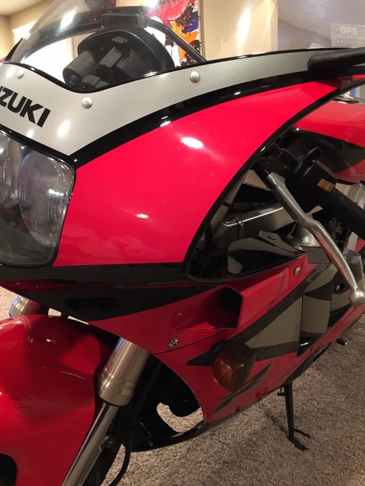 1992 GSXR400. It’s a gorgeous rider with only 10,944 miles. It’s all stock except for the Yoshimura slip on. All fairings are 100% genuine Suzuki OEM. Bike is excellent condition and has a few light scratches on the lower cowling and a rub mark on the left side rear cowling. There are a few tiny garage marks on the lower right side cowling also. Even with the blemishes, the bike looks amazing and the flaws don’t even catch the eye. This GSXR400 is a very clean bike and dripping with curb appeal. Bike is in tip top
