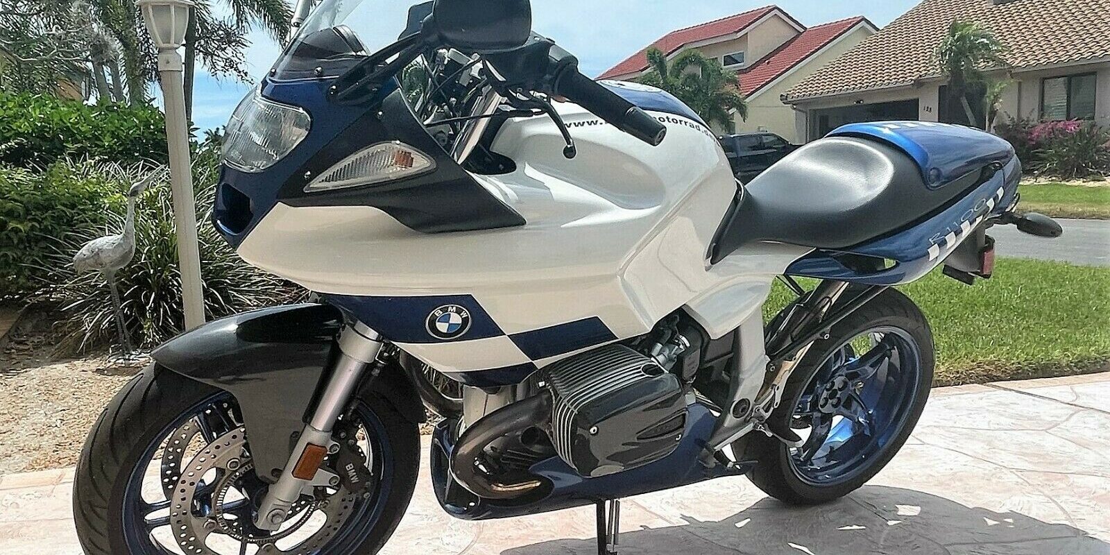 NOTE: BMW Boxer Cup Replicas (BCRs) were limited production versions of their popular boxer twin 1100cc 98 HP / 75 Ft. Lbs. torque sport machines with the cool Ducati-esque under-seat Titanium ZTechnik exhaust pipes. They also had the sports options offered at the time of the higher suspension and beveled carbon fiber valve covers for added ground clearance in the turns, and therefore slightly taller seating position, with other carbon bits such as the front fender, a 5.5″ wide rear rim, and the lovely blue and white custom factory livery on body and wheels. Neither the rear fender has been chopped nor any other part of the bike modified that will detract from the intrinsic value this fine machine possesses.