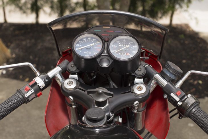 Regarding the value – this one is also far from “correct”. Don’t get me wrong, I like the upgrades and like this bike, but its not correct on a few things: Lafranconi pipes, Tarozzi rearsets, Marzocchi shocks, re-pop seat… It does have correct handlebar switchgear and turn signals, both of which are MIA on a lot of bikes.