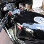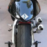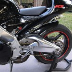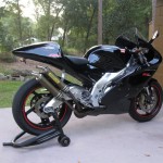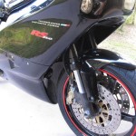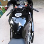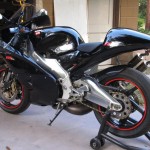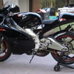 This RS250 appears to be pretty spotless (which is very difficult to maintain as two strokes are notoriously dirty and forever spitting up oily goo on the shiny bits), and includes some nice add-ons including the Arrow carbon/kevlar silencers. These bikes have tremendous potential (check out the Aprilia Forums for info on how to produce 70+ HP from these little 250s!), but smokers are particularly picky about matching modifications up carefully – real power is usually the result of compression, porting and pipe together along with a matching ECU. Fortunately, a tremendous amout of information is available on these bikes and the engine can share parts with the Suzuki RG 250 series, from which it was derrived.