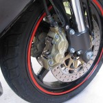 With a dry weight of 140 kilograms and two 298 mm diameter floating disks on the front wheel, with two Brembo twin-piston callipres on each (with four differentiated diameter pistons), the front brake has more power than you’d have thought possible. Though it has loads of feel, it warrants immense respect because once you’ve become comfortable with the RS around the roads, you’ll find yourself getting into corners with the back wheel OFF THE GROUND!!!