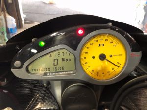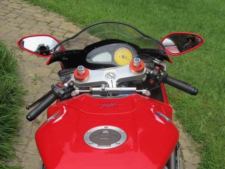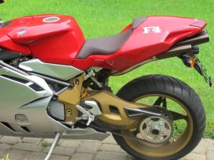 Evidently on display since just after its first oil change, this F4 750 Oro’s picture is next to “magnificent” in Webster’s. The gold magnesium just glows in the right light. Pictures with Mr. F from FBF are icing on the cake. The owner’s comments from the eBay auction: