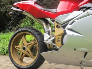 Designed by Massimo Tamburini, the F4 is striking from every angle and the specs read like an exotic motorcycle laundry list. Ferrari helped design the radial-array four valve heads for the inline-4, and Tamburini himself had a hand in the 4-2-1-2-4 exhaust. On the Oro, bodywork and fuel tank are carbon fiber, and magnesium wheels, frame connectors, and swingarm are anodized gold. 49mm Showa forks have quick release axle clamps, and the monoshock linkage allows ride height changes without changing shock settings.