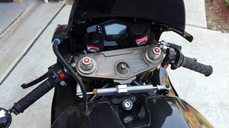 This is an ex-privateer’s racebike, and for all the fun of turning a road bike into a racer, bringing a race machine back to the street can be tougher. The owner answered the challenge of integrating all the great mods and beautifying the lot. This bike has had some updates for the track, and some on the way back to the street. With a built race engine, 1098 front end and race dash, the owner added a full carbon fiber body, including the fuel tank. Here’s one paragraph from the long description in the eBay auction: