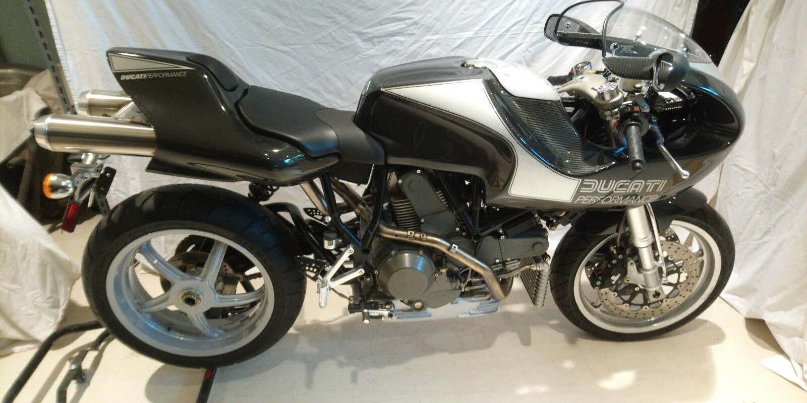 The MH900e is perhaps the most recognizable of the Pierre Terblanche designs. The “e” in the nomenclature stands for evoluzion (evolution in US-speak), referring of course to the Mike Hailwood replicas built on the 900cc bevel drive platform of the 1980s. Taking the spirit of the original but updating it to the new Supersport/Monster/Sport Classic desmodue foundation, the MH900e was part replica, part homage, and part new direction for Ducati. Power was via the standard 900cc, air-cooled, two valve workhorse of the Ducati lineup. Ditto with the gearbox. Major components aside, the bodywork, fuel tank, exhaust and asymmetrical trellis swing arm were pure MH900e. So, too, was the riding position with a long reach to the low bars. But comfort was not the design goal. Creating a sensation was the goal – and on this front Ducati hit one out of the park. Nearly 20 years later these are still coveted collector machines. And what could be more coveted than the very first one produced?