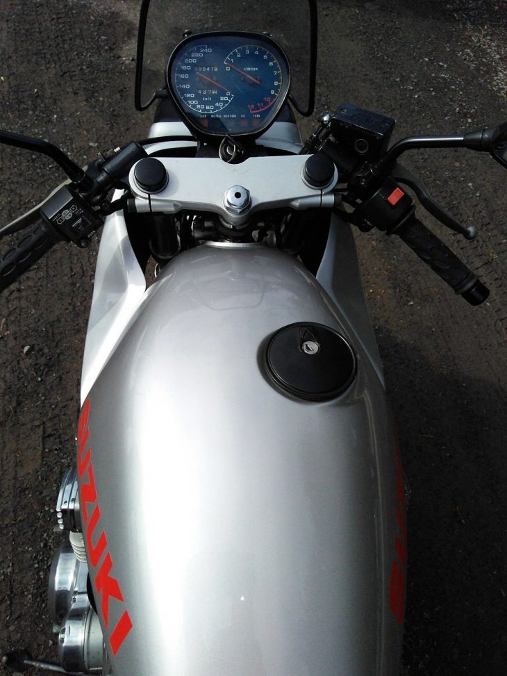Largely eclipsed by the GSX-R line-up, the Katanas soldiered on in the showroom providing options for those less track-oriented. Kind of the Hayabusa of its day, the 1100 Katana was Cycle World’s fast machine for 1983, using a half-mile yardstick. The design got high marks for stability once the stiff suspension was backed out to minimums. The riding position calling for speed, this Katana could certainly be on the road, but with a little attention could be shown as well…