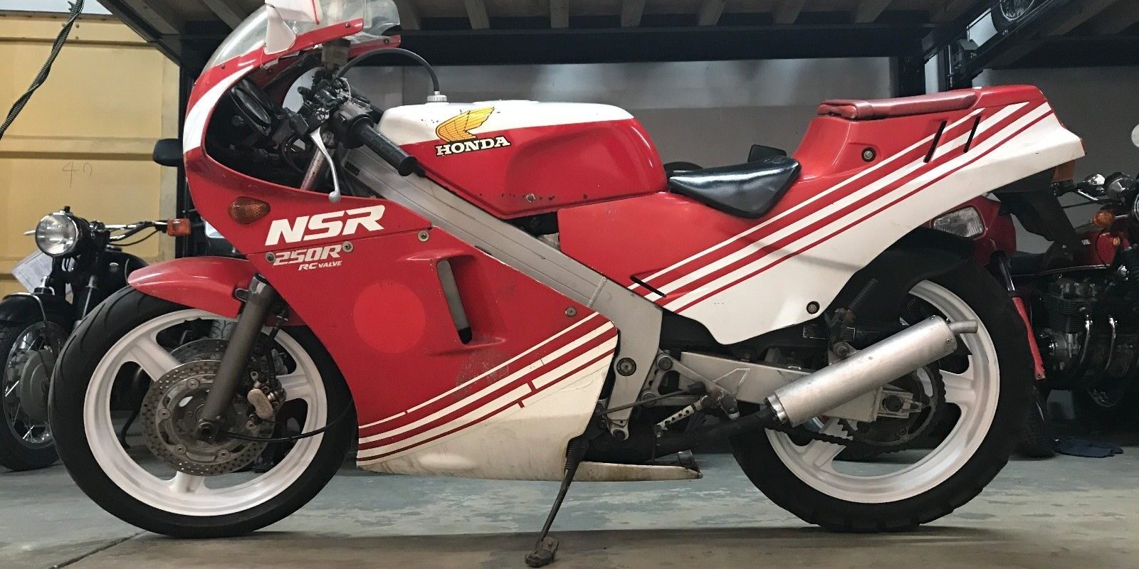 We don’t often post bikes this hammered well-loved here at RSBFS, but this one caught our eye. Ignore, if you will, the mismatched tires, the forgotten seat upholstery and, well, the rust. What we have here is an example of the 1987 Honda NSR250R that you could actually ride.