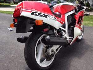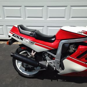 The GSX-R750 reviewed as a quick-handling powerhouse, with serious racebike ergonomics, and very nearly beat the company’s own 1100 to the 1/4-mile traps. A nicely resolved update to a ground breaking design. This particular GSX-R is a win-win, great factory cosmetics and all maintenance issues addressed…