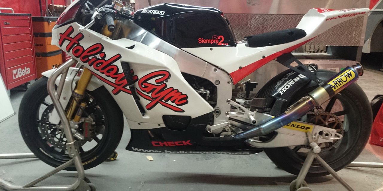 This is a genuine race bike, used in anger during the 2010 Moto2 season, sponsored by Holiday Gym and ridden by Yannick Guerra. A stepping-stone to the premier class of bikes, Moto2 replaced the two-stroke 250 GP class when the series went to four-stroke engines: riders in Moto2 are looking to prove themselves worthy of a shot at the big leagues.
