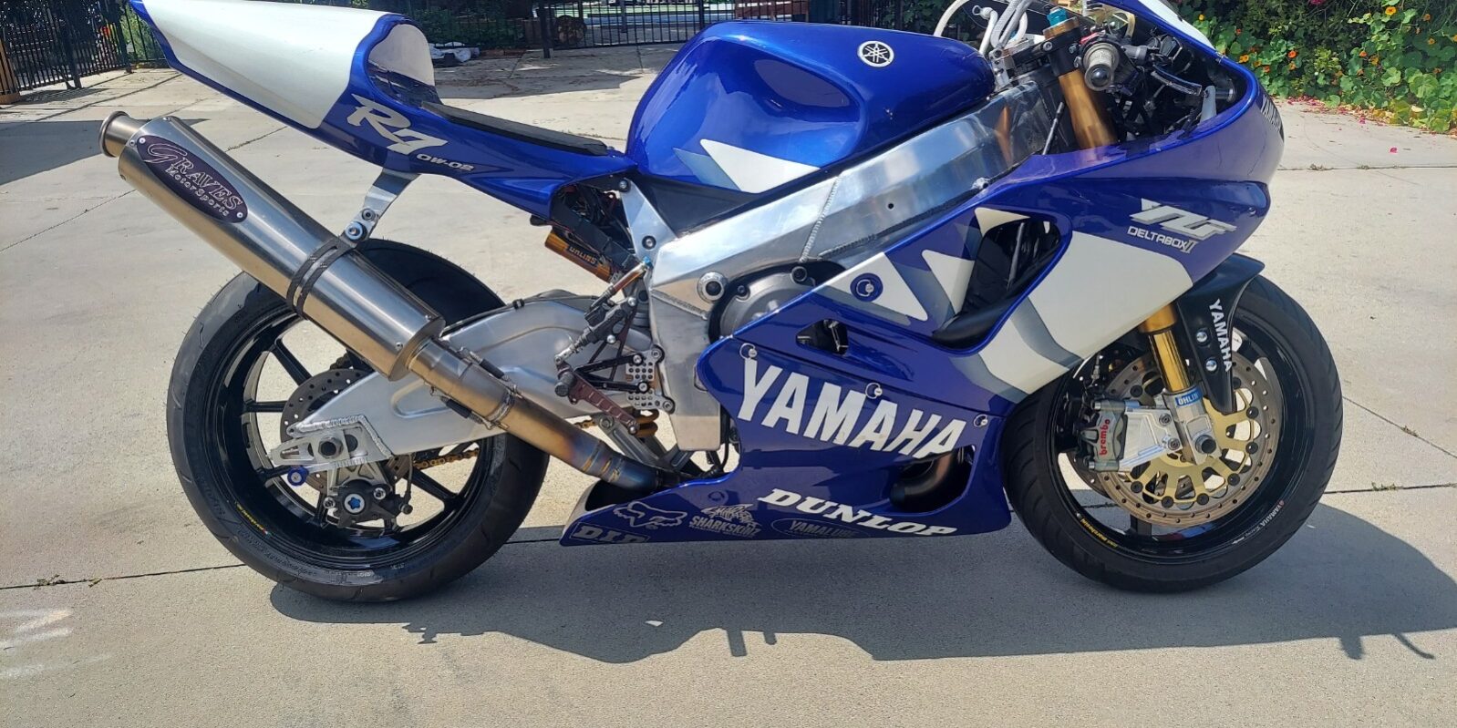 2 decades of collection netted 4 r7s. Frame was originally modified for a 99 1000cc carburated motor, but I decided to modify it to accept an 07 motor instead. As a certified welder and fabricator, I machined, fabricated and welded all necessary brackets fixtures and jigs to accomplish this task. Gas tank is modified to run an 07 fuel pump. Brackets for battery, ecu and cdi was integrated to original seat frame. Dash, radiator, exhaust manifold are from donor 07 r1. Graves titanium mid pipe and muffler, Brembo master cylinder, radial conversion mounting brackets, Brembo radial calipers and floating rotors. Bazzaz fuel injection and traction controller, wet and dry switch, quick shifter, shift light, gp pattern. Attack performance rearsets. 17″ Marchesini magnesium 5 spoke front wheel, 17″ 10 spoke forged magnesium rear wheel. Michelin front tire/Dunlop sportsmas Q3 rear. New DID 520 chain, 17t front/45t rear sprocket. Inboard ohlins steering damper.