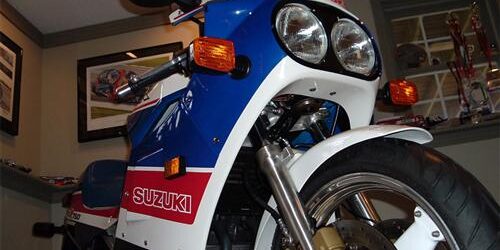 Suzuki took the GSXR750 and added trick bits; the forks were very high tech for their time. They had what was called “Anti-Dive” technology. They were electric activated, telescopic, coil spring, oil damped, spring preload and were four-way adjustable. The rear shock was just as special with a gas charged remote reservoir and was aluminum bodied. Racing tail section that was hand laid fiberglass with a custom solo seat. Custom colored wheels. Racing clutch lever and dry clutch. This made swapping out clutch plates at the track a faster and cleaner job as well as keeping the oil free of clutch plate materials and they run cooler. The clip-ons were wider. Front brakes were upgraded. The engine got a magnesium cylinder head as well as sprocket covers to save weight. The front brakes had speacial-designed hoses. The fairing had additional cooling ducts as well as quick release fasteners. Even the emblem on the side was bike-specific. And finished with a gold plated chain with an all-aluminum chain guard. All this and it weighed in six pounds less than an off the shelf 750.